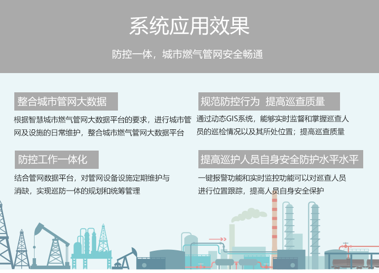 通過《智慧城市燃?xì)釭PS巡檢管理系統(tǒng)》,規(guī)范巡檢行為,強(qiáng)化巡查質(zhì)量,實(shí)現(xiàn)城市燃?xì)夤芫W(wǎng)防控工作科學(xué)化、規(guī)范化、智慧化和大數(shù)據(jù)平臺(tái)化的推進(jìn)和實(shí)施,確保城市燃?xì)夤芫W(wǎng)安全暢通